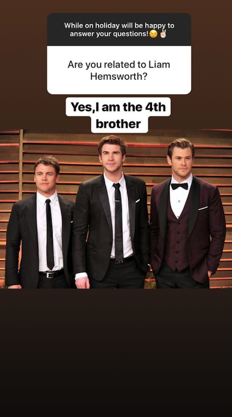 Сам Карен, кстати, в ответ на вопрос в Instagram про его связь с Лиамом выложил фотографию братьев Хемсвортов и написал: «Да, я четвертый брат».