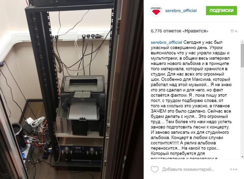 14 октября стало известно, что из офиса продюсера и композитора Максима Фадеева (47) в ночь с 13 на 14 октября был украден альбом группы SEREBRO «925», который должен был быть опубликован уже в конце текущего месяца.