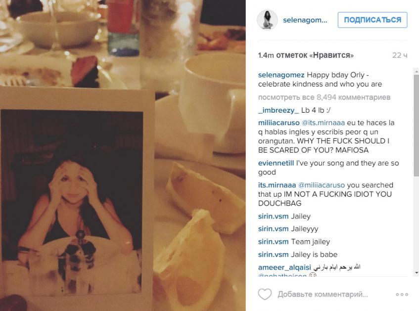 Кроме того, тогда же артистка развесила в своем Instagram фотографию, сделанную во время застолья, которую она подписала «С днем рождения, Орли». Удивительно, но на появление этого снимка больше отреагировали поклонники Джастина Бибера (21), предположившие, что Селена опубликовала снимок только для того, чтобы позлить бывшего молодого человека.