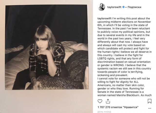 «В прошлом я не хотела публично высказывать свое политическое мнение, но из-за нескольких событий в моей жизни и в мире за последние два года я чувствую себя совсем по-другому, — написала Тейлор, — Я всегда голосовала и всегда буду голосовать, исходя из того, какой кандидат будет защищать и бороться за права человека, которые, я считаю, мы все заслуживаем в этой стране. Я верю в борьбу за права ЛГБТ, и что любая форма дискриминации по признаку сексуальной ориентации или пола является неправильной. Я считаю, что системный расизм, который мы все еще видим в этой стране по отношению к цветным людям, ужасен, отвратителен и распространен. Я не могу голосовать за кого-то, кто не будет готов бороться за достоинство для всех американцев, независимо от их цвета кожи, пола или того, кого они любят. Баллотироваться в Сенат штата Теннесси будет женщина по имени Марша Блэкберн. Как бы мне ни хотелось в прошлом продолжать голосовать за женщин на посту, я не могу поддержать Маршу Блэкберн. Ее голос в Конгрессе ужасает и пугает меня. Она голосовала против равной оплаты труда женщин. Она проголосовала против повторного утверждения закона о насилии в отношении женщин, который пытается защитить женщин от насилия в семье, преследования и изнасилования на свидании. Она считает, что предприятия имеют право отказывать в обслуживании гомосексуальным парам. Она также считает, что они не должны иметь права вступать в брак. Это не мои ценности. Я буду голосовать за Фила Бредесена в Сенате и Джима Купера в Палате представителей. Пожалуйста, голосуйте исходя из того, кто больше всего соответствует вашим ценностям. Мы можем никогда не найти кандидата или партию, с которыми мы согласны на 100% по каждому вопросу, но мы все равно должны голосовать. За последние два года многим умным, вдумчивым, одержимым собой людям исполнилось 18 лет, и теперь у них есть право и привилегия сделать свой голос значимым. Но сначала вам нужно зарегистрироваться, что быстро и легко сделать. 9 октября — последний день регистрации для голосования в штате Теннесси».