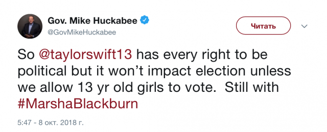 Многие из поклонников певицы поддержали ее и согласились с мнением Свифт, а вот политики ее позиции не разделили. Например, двукратный кандидат в президенты Майк Хакаби написал в Twitter: «Итак, @taylorswift13 имеет полное право быть политически активной, но это не повлияет на выборы, ведь мы не позволим 13-летним девочкам голосовать. Все еще с #MarshaBlackburn».