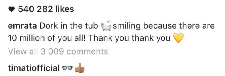 Эмили опубликовала фото, на котором на ней из одежды только ожерелье и очки, а заодно поблагодарила всех подписчиков. «Улыбаюсь, потому что вас уже 10 млн! Спасибо вам, спасибо!», — написала счастливая девушка.