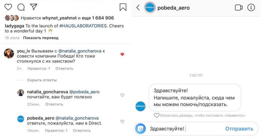 А вот девушка по имени Юлия Иванова решила пойти дальше и в комментариях пожаловалась на авиакомпанию «Победа» за то, что ее не пустили на рейс. Юлию, кстати, поддержала журналистка Наталья Гончарова! И (что самое интересное) им ответили!