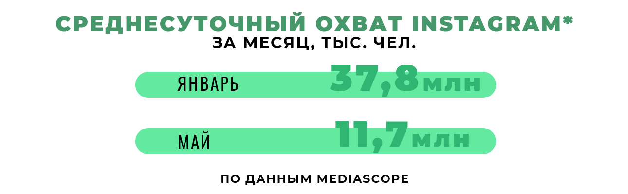 Прошло уже почти четыре месяца, а контент на их страницах продолжает публиковаться с той же регулярностью, что и тогда. К слову, речь идет и о рекламных постах, которые, казалось бы, было запрещено размещать. Однако не стоит забывать, что мы говорим о блогерах, для которых социальная сеть была основной площадкой для заработка. Адаптировавшись под новые реалии, они дали себе шанс на минимальные потери. Но вот у простых пользователей возникли проблемы. Если еще в начале среднесуточный охват Instagram * в России был почти 38 млн человек, то к концу мая, по данным Mediascope, он упал до 11,7 млн и вышел из десятка самых посещаемых сайтов.