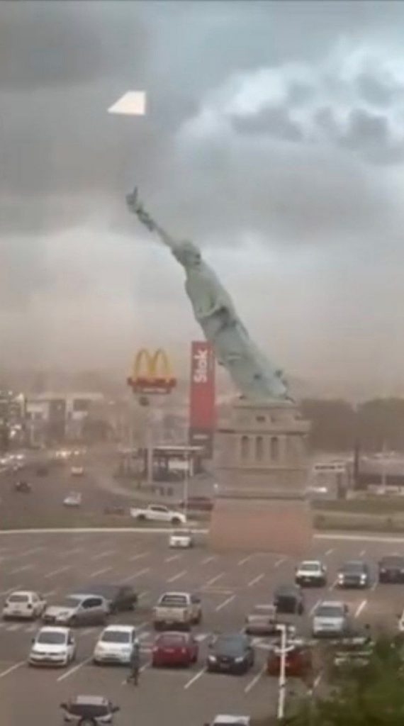 Погоду в мире не выдерживает даже непоколебимая Статуя Свободы, пусть и ее 40‑метровая копия. Невероятный и немного пугающий инцидент произошел в бразильском муниципалитете Гуаиба. Из‑за мощного шторма обрушилась гигантская копия Статуи Свободы, сообщается на сайте NDTV.