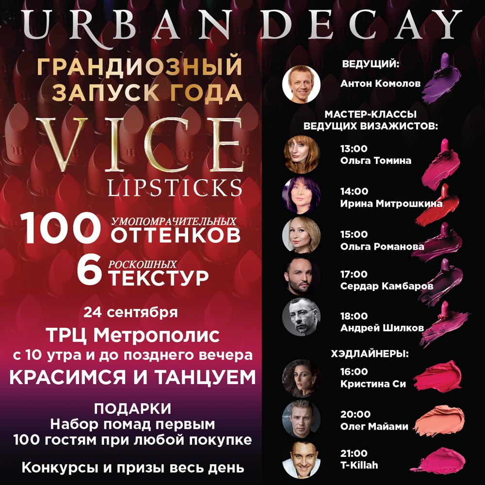 Urban Decay приглашает всех поклонников бренда в эту субботу (24 сентября) в ТРЦ «Метрополис». Ты можешь прийти в любое удобное время с 10 утра и до позднего вечера. Что тебя ждет? Грандиозный запуск года – новая коллекция помад Vice Lipsticks. Выбрать будет из чего – 100 оттенков!
