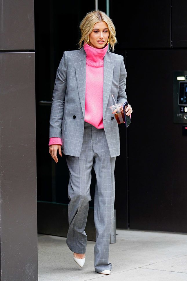 Если в твоем гардеробе есть брючные оверсайз-костюмы, то этот прием тебе точно понравится! Вместо рубашки надевай свободный свитер с высоким горлом. Можно остановиться на пастельных цветах или выбрать яркий розовый свитер, как Хейли Бибер.