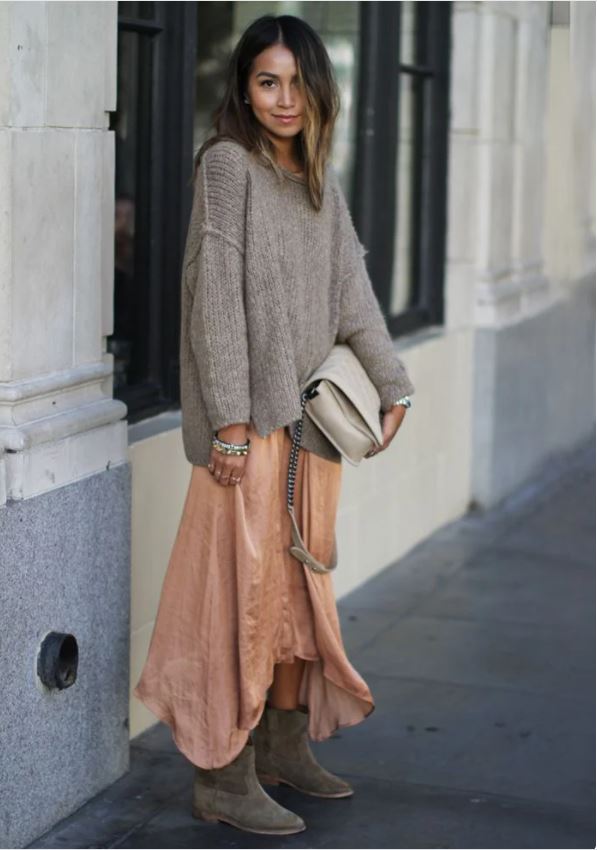 Носить платья можно и в холодную погоду. Лучше всего для осени выбрать модели миди. А чтобы точно не замерзнуть, надевай поверх платья свитер или джемпер. В идеале дополнить образ высокими сапогами.
