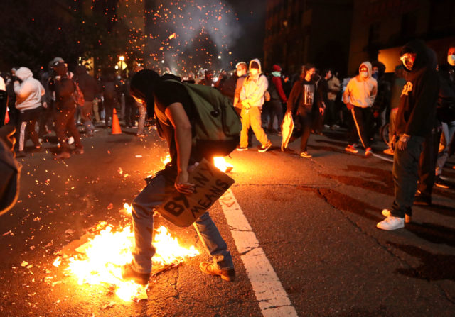 Возмущенные люди бьют витрины и переворачивают машины, разводят костры на улицах и небольшими группировками ходят по городу, требуя обратить внимание на дискриминацию афроамериканцев.