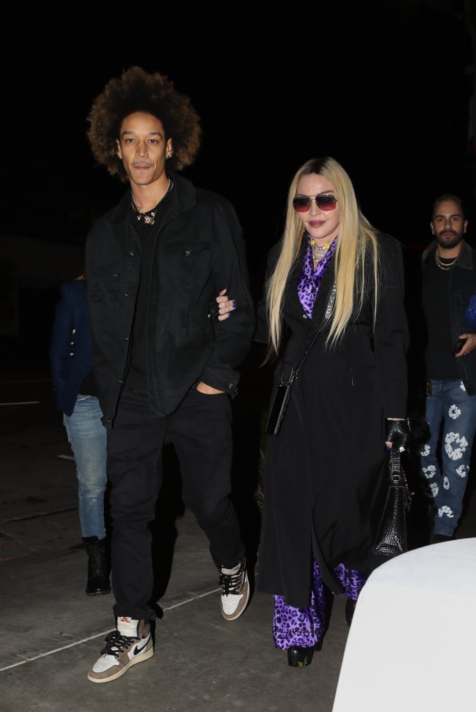 В атласном леопардовом костюме и черном пальто: редкий выход Мадонны с ее молодым парнем