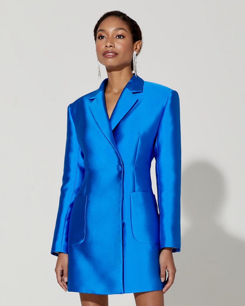 За последние пару месяцев насыщенный синий стал одним из самых популярных цветов сезона. Поэтому вполне ожидаемо, что дизайнеры предлагают нам выбрать новогодний образ в таком оттенке: от шелкового пиджака до платья-комбинации.