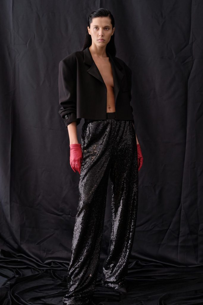 Пайетки или блестки — еще один беспроигрышный вариант в Новогоднюю ночь. Кстати, именно на нем остановился ваш редактор моды и выбрал прозрачный мерцающий топ черного цвета.