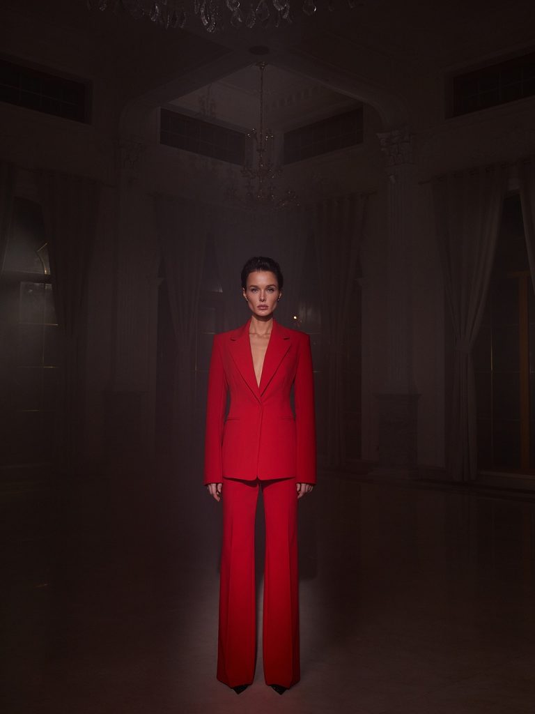 И какой Новый год без ярко-красного аутфита? Наш фаворит брючный костюм мужского кроя в таком цвете (дополни черными мюлями с квадратным мысом).