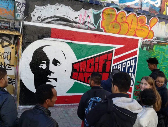 К юбилею президента в трех европейских городах появились граффити с изображением Путина. В Барселоне Путин изображен подмигивающим на фоне слов: «Каждый человек имеет право на самоопределение». На граффити в Париже изображение сопровождается надписью: «Пацифист, с днем рождения». В Берлине, в нескольких десятках метров от места, где проходила Берлинская стена, юбиляр нарисован сидящим в кресле в окружении белых голубей.