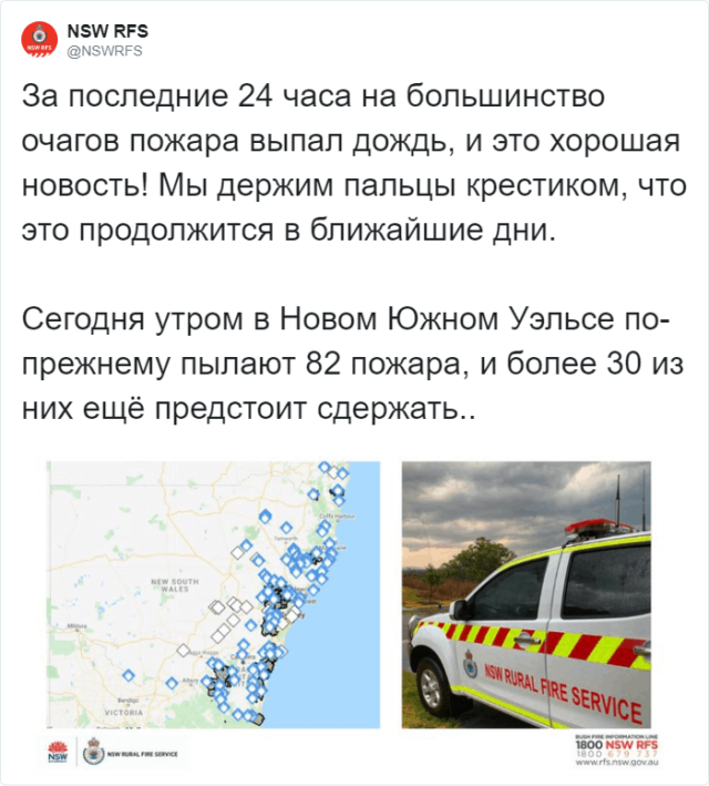 На это утро в Южном Уэльсе по-прежнему остаются активными 82 очага, и более 30 из них еще предстоит сдержать…», — пишут в Twitter пожарной службы Нового Южного Уэльса.