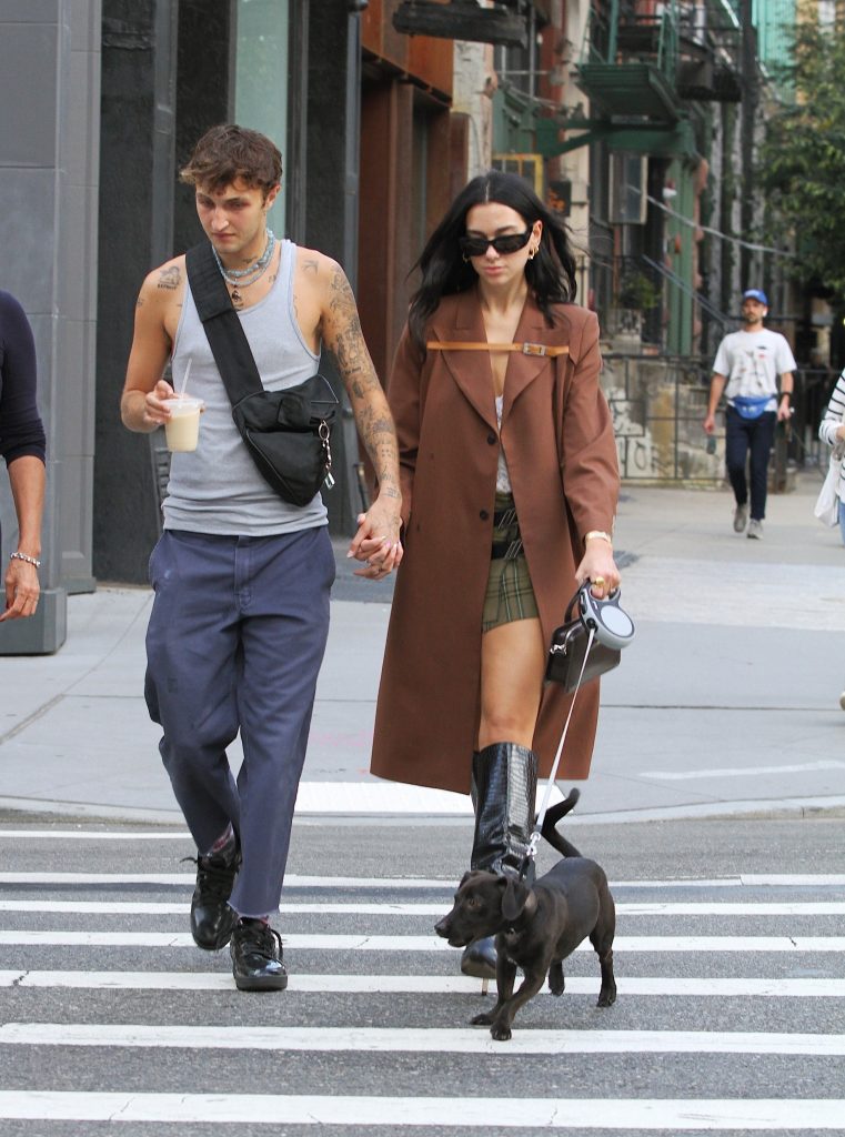 Папарацци сфотографировали Дуа Липу во время прогулки с Анваром Хадид в Нью-Йорке. Певица появилась в мини-юбке в клетку, которую дополнила высокими кожаными сапогами By Far и пальто в коричневом оттенке.