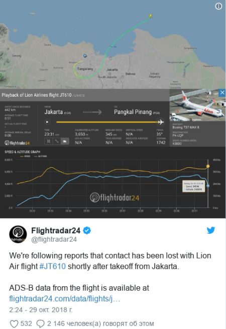 Пассажирский Boeing 737 авиакомпании Lion Air вылетел из Джакарты в 6:20 по местному времени (2:20 по Москве). Через 13 минут после взлета связь с лайнером была потеряна. Сообщается, что пилот запрашивал разрешение на возвращение в аэропорт Джакарты.