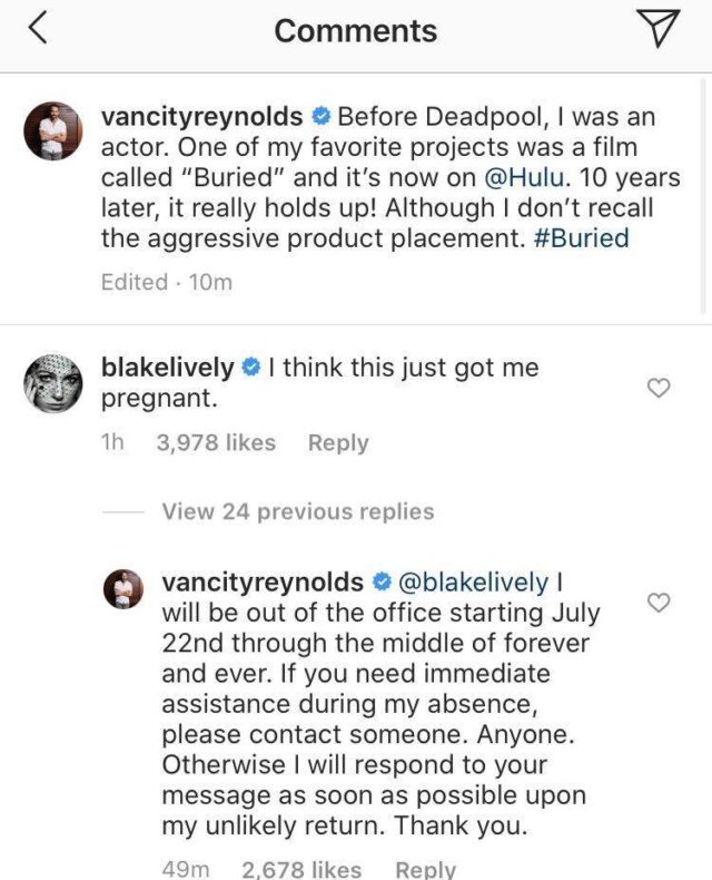 И, видимо, идея стать отцом в четвертый раз Рейнольдса совсем не впечатлила. Актер ответил супруге в своей привычной манере: «Меня не будет в офисе с 22 июля и до скончания веков. Если вам понадобится незамедлительная помощь за время моего отсутствия, пожалуйста, обратитесь к другому. К кому угодно. В противном случае я отвечу на ваш запрос как можно быстрее после моего маловероятного возвращения. Спасибо».