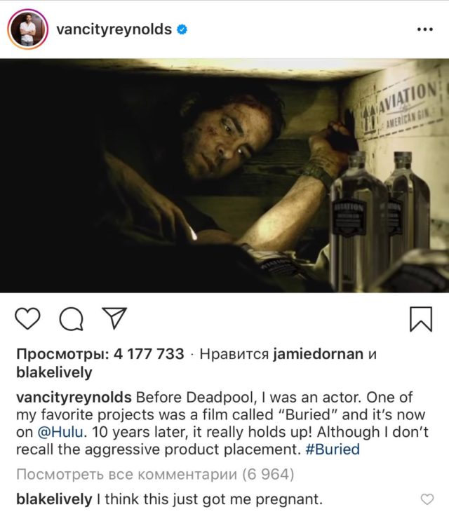 Вот у кого точно весело на страницах в Instagram, так это у Блейк Лайвли (32) и Райана Рейнольдса (43): актерам всегда есть, над чем пошутить. На этот раз поводом для смеха стали слухи о четвертой беременности Лайвли. Все началось с того, что Райан опубликовал отрывок из фильма «Погребенный заживо» со своим участием. Блейк моментально отреагировала на пост и написала: «Мне кажется, я только что забеременела».