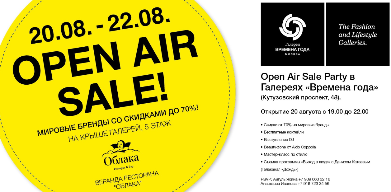 С 20 по 22 августа в галереях «Времена года» состоится грандиозный Open Air Sale. Мероприятие пройдет в самом прямом смысле «на высоте» − на крыше торгового центра.