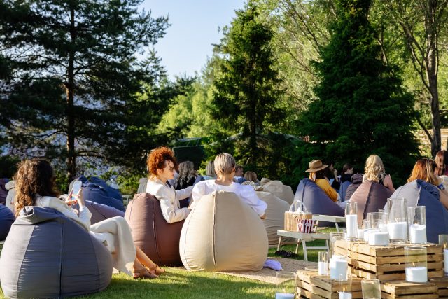 Кстати, о детстве. На одном из стендов, декорированных сеном и полевыми цветами, были развешаны детские фотографии гостей, которые заботливо собирала команда бренда. «Для полного погружения в беззаботное время летних каникул не хватает только велосипеда, бадминтона и, конечно, мороженого», – скажете вы. А я отвечу, что этот момент Юлия Василевская тоже предусмотрела. И к вышеперечисленному добавила еще дженгу, музыку (за которую отвечала DJ Ника Кубрак), кинотеатр под открытым небом с попкорном и невероятно вкусную еду от итальянского шефа Антонио Фреза.