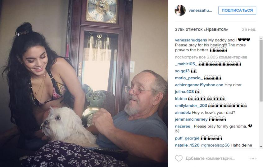 Об этом Ванесса рассказала своим подписчикам в Twitter, обратившись к ним за помощью. «Эй, ребята! Дела у моего папы не очень хорошо, – написала актриса. – Пожалуйста, помолитесь за него! Это очень важно для меня». Известно, что отцу актрисы, бывшему пожарному Грэгу Хадженсу, диагностировали рак четвертой степени, с которым он борется уже в течение года.