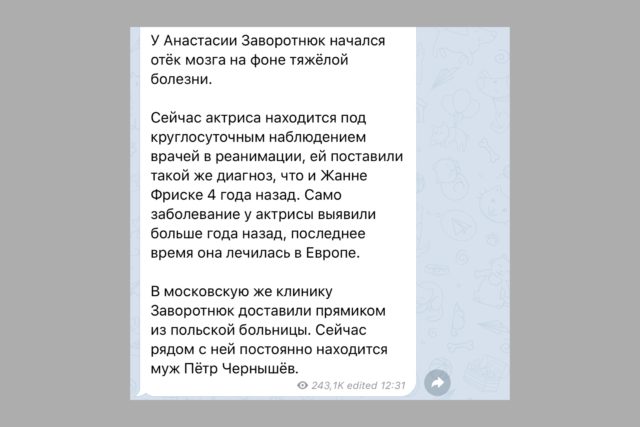 Вчера появилась информация о том, что актрису Анастасию Заворотнюк (48) больше двух недель назад госпитализировали в крайне тяжелом состоянии: как сообщил Telegram-канал Mash, у нее начался отек мозга на фоне тяжелого заболевания, в пятницу она была переведена в реанимацию. Ночью на том же канале написали, что Заворотнюк ввели в медикаментозную кому.