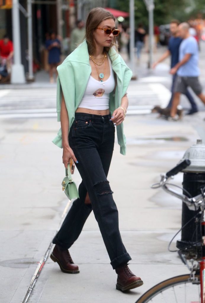 А вот Джиджи постоянно носит мартинсы с джинсами. Нам очень нравятся ее летний вариант с базовым топом и желтыми ботинками.