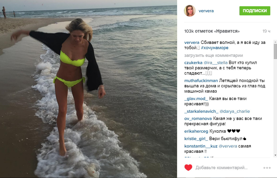 На снимке, который певица озаглавила «Сбивает волной, а я всё иду за тобой», девушка запечатлена на пляже в ярком купальнике и черном платке, которые только подчеркивали великолепную фигуру.