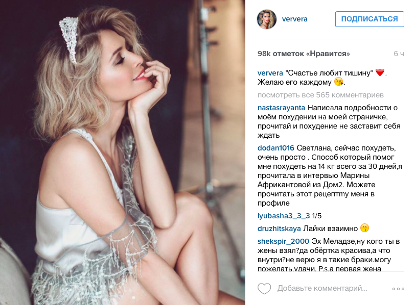 Вера Брежнева некоторое время держала молчаливую оборону, но потом коротко и лаконично призналась о причине молчания с своем профиле Instagram: «Счастье любит тишину. Желаю его каждому».