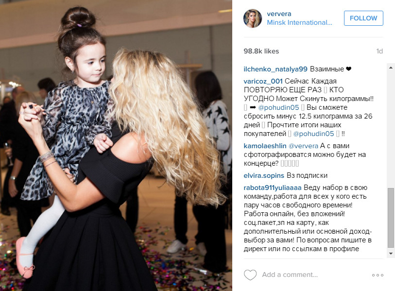 И вот вчера Вера выложила фото в Instagram, на котором запечатлена танцующей с маленькой девочкой. «Согревают тёплые воспоминания о вечере…. там чудесная малышка танцевала со мной)) #сладкаядевочка Дети — моя слабость,» — написала певица под фото. Стоит отметить, что у самой Брежневой растет 14-летняя дочь Соня Киперман.