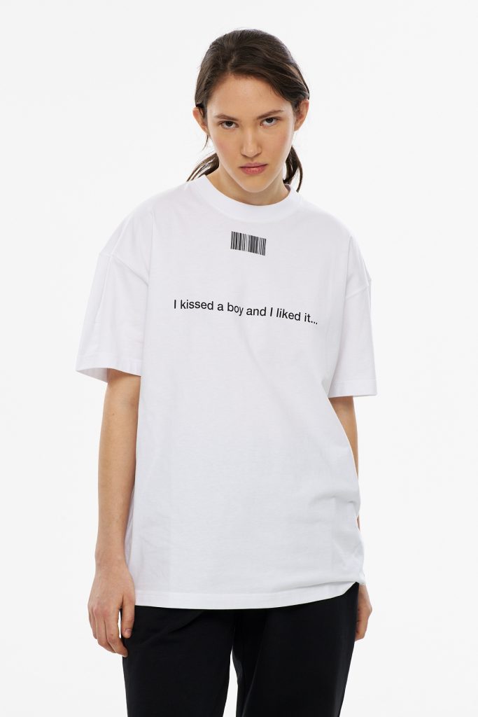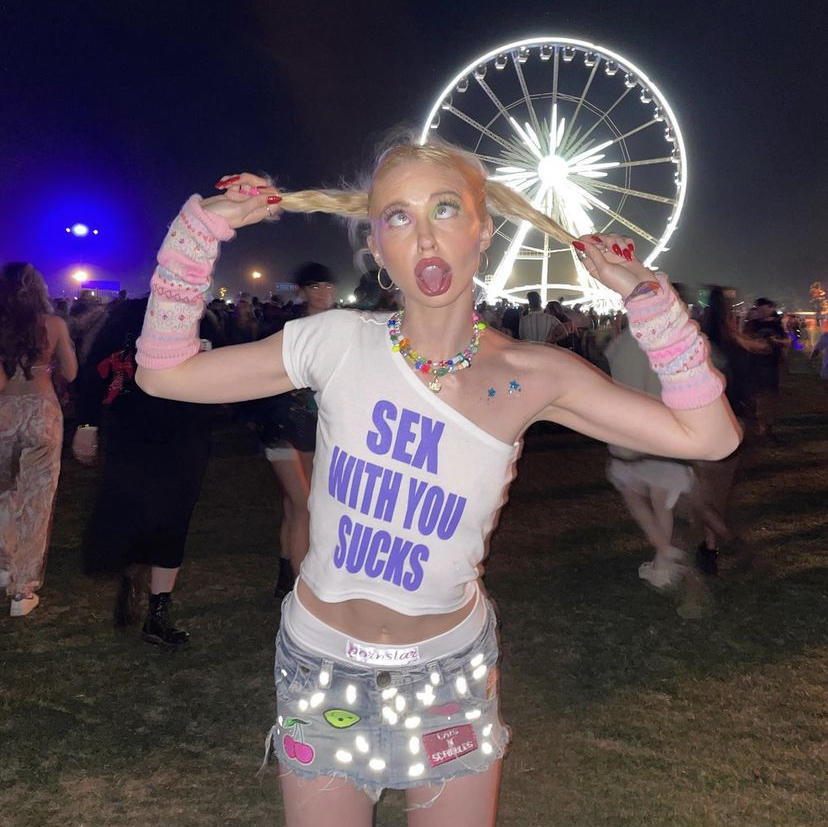 Сейчас этот тренд с новой силой подхватили фэшн-инфлюенсеры по всему миру. И фестиваль «Коачелла» послужил наглядным подтверждением. В первый уикэнд звезда сериала «Эйфория» Хлоя Черри появилась в футболке с надписью Sex with you sucks, а Дуа Липа выложила серию фотографий в социальные сети в топе с фразой Smile For The Camera.