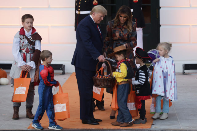 Во время празднования Хэллоуина в Белом доме Дональд и Мелания Трамп (49) раздавали детям конфеты. И одному из детей они дали сладости не в руки, а положили на голову (ребенок был в объемном костюме Миньона). И с малыша посыпались шоколадки. Смотри!