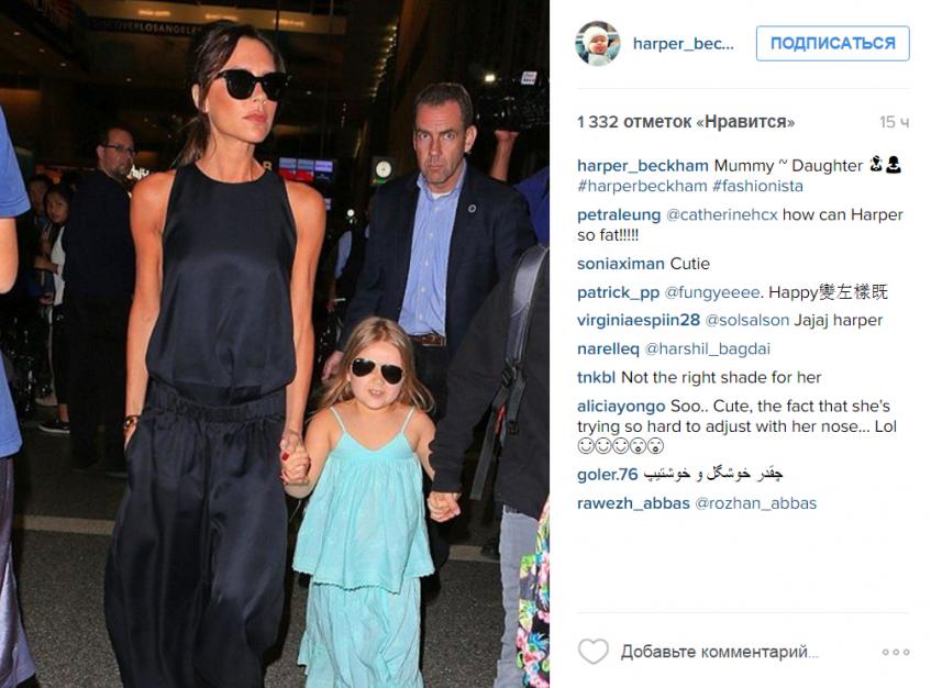 Так, 17 апреля папарацци застали Викторию, Харпер, а также двоих младших сыновей четы, Ромео (10) и Круза Бекхэмов (10), в аэропорту Лос-Анджелеса. И, хотя почти вся семья была в сборе, больше всего внимание фотографов привлекали именно дочка и мама.