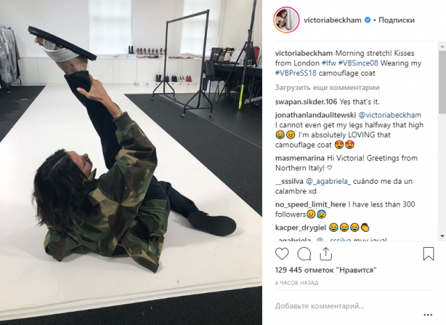 В 2016 году Виктория Бекхэм (44) выставила в Instagram фотографию своей растяжки. На снимке она лежит на диване в кюлотах и черном топе, подняв одну ногу перпендикулярно полу. «Поразительно, что можно делать в кюлотах… Занятия балетом не прошли даром», — подписала дизайнер фото.