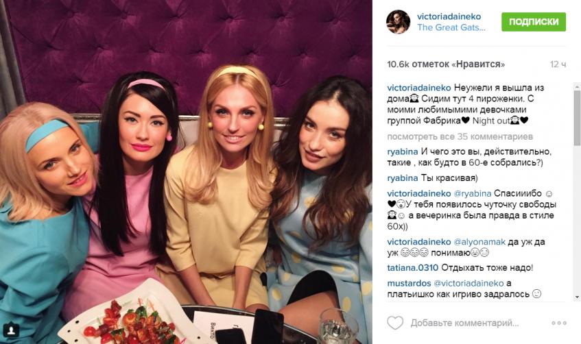 Об этом звезда рассказала поклонникам в Instagram, опубликовав фото с участницами группы «Фабрика» Ириной Тоневой (38), Александрой Савельевой (31) и Александрой Поповой (24). «Неужели я вышла из дома. Сидим тут 4 пироженки. С моими любимымими девочками группой Фабрика», — поделилась Виктория.