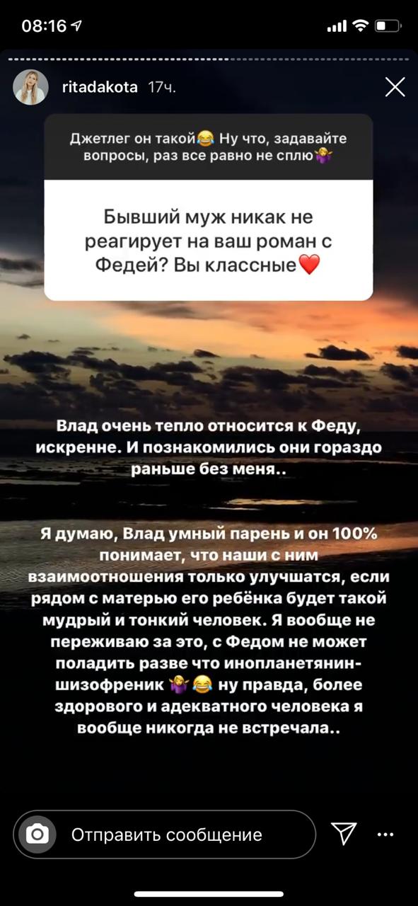 Рита общалась с фолловерами в Stories, и ей задали вопрос по поводу отношений бывшего мужа Влада Соколовского (28) и нынешнего бойфренда, режиссера Федора Белогая (32). Рита ответила: «Влад очень тепло относится к Феду, искренне. И познакомились они гораздо раньше без меня…»