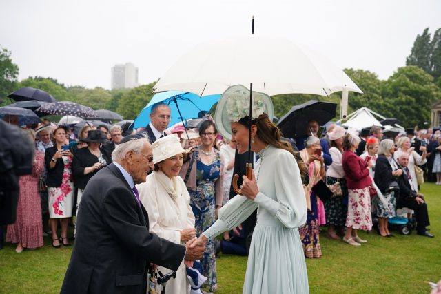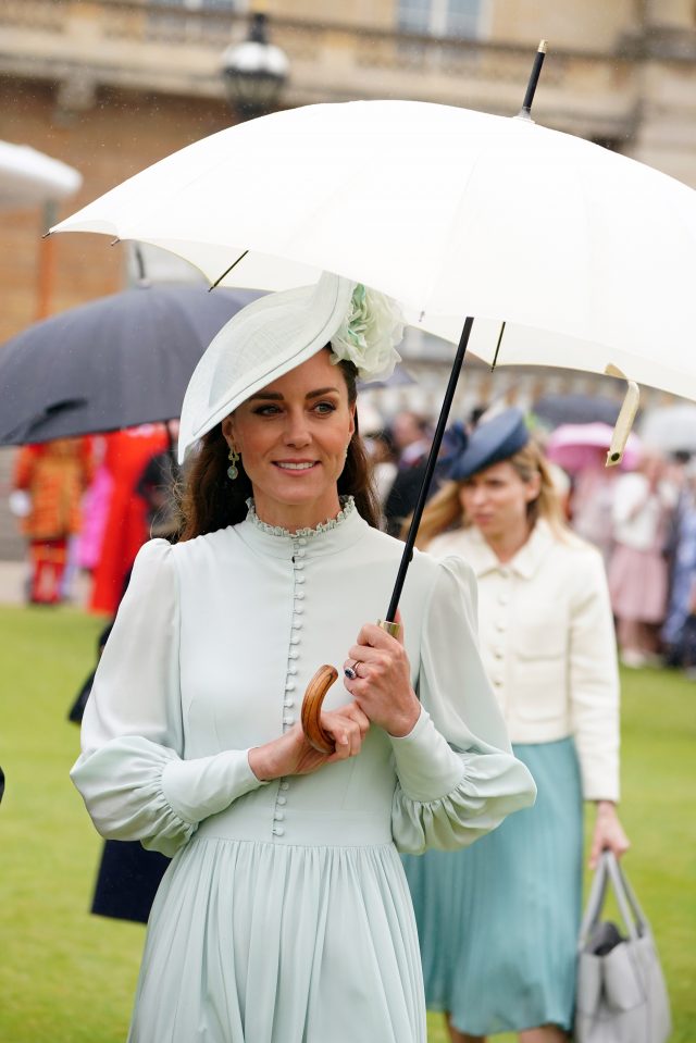 На встречу Кейт надела сшитое на заказ ее частной портнихой платье с пуговицами, высоким воротом и длинными рукавами. Дополнила наряд аксессуарами: шляпой, декорированной белым цветком, клатчем и серьгами мятно-зеленого цвета. Герцог и герцогиня Кембриджские заменили королеву Елизавету II на вчерашней вечеринке в саду Букингемского дворца.