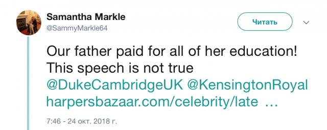 Именно эти слова и не понравились Саманте. «Папа платил за ее учебу в колледже! Меган «забыла» сказать об этом в самой важной части речи, но есть доказательства ─ счета (об оплате). Я люблю свою сестру, но это смешно. Ты не можешь так лгать, Мэг!», — написала она в своем Twitter.