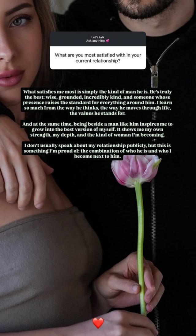 В Stories, на фоне трогательного совместного фото, криптоблогер и стримерша расхвалила миллиардера как идеального партнера, подчеркнув, как он меняет ее к лучшему. «Он действительно лучший: мудрый, уверенный, невероятно добрый. Он помогает мне расти, раскрывать силу, глубину и становиться женщиной, которой я хочу быть. Обычно я не говорю публично о своих отношениях, но этим мне хочется поделиться: я горжусь тем, кто он», – поделилась она, добавив, что рядом с ним чувствует себя вдохновленной на самосовершенствование.