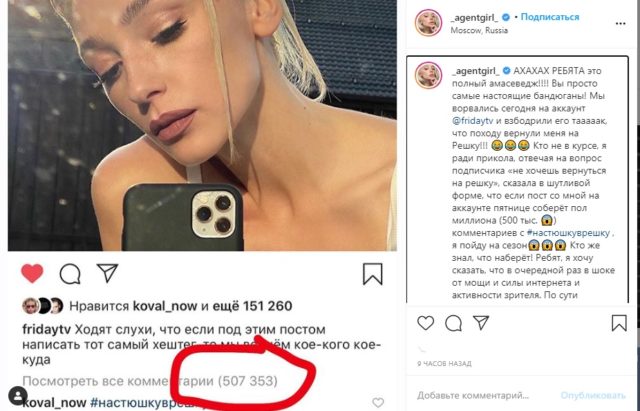 Мечта поклонников Насти Ивлеевой (29) может стать реальностью! Недавно в своем Telegram-канале блогер отвечала на вопрос, хочет ли она вернуться в «Орел и Решку» на телеканал «Пятница!». И Настя заявила, что пойдет в новый сезон, если под постом с ее фотографией в Instagram телеканала наберётся 500 тысяч комментариев «#настюврешку».