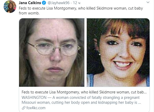 В октябре 2007 года Окружной суд Западного округа штата Миссури признал Лизу Монтгомери виновной в убийстве беременной женщины и похищении ее ребенка. Хотя адвокаты пытались доказать, что обвиняемая страдала от галлюцинаций и псевдоциеза (ложное убеждение больной в том, что она беременна – прим. ред.), присяжные приговорили ее к смертной казни.