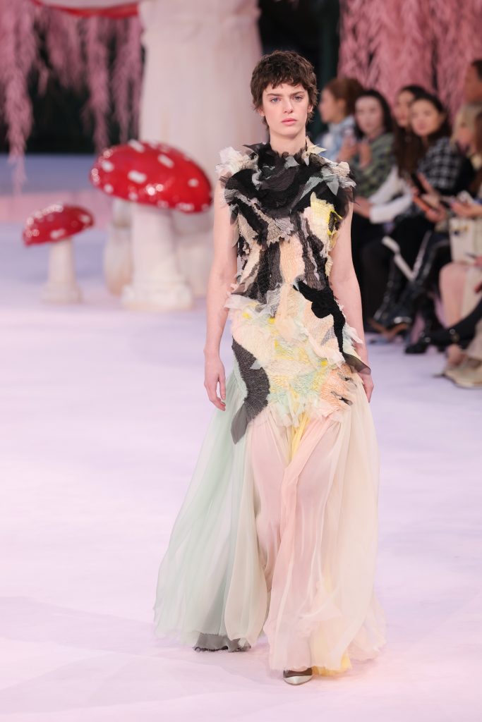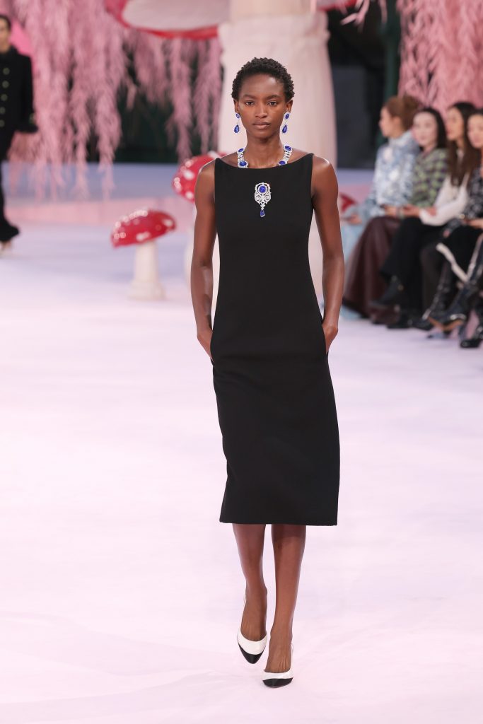 Кутюрная коллекция Матье Блази для Chanel действительно получилась очень легкой и прозрачной. В центре внимания классические силуэты, выверенные до идеала, разнообразные ткани, прозрачные сумки, акцентные туфли и, конечно, оммаж на «украденные из Лувру» украшения. Отдельное внимание стоит уделить сет-дизайну, благодаря которому гостей шоу перенесли в сказочный грибной мир.