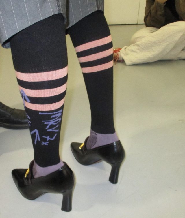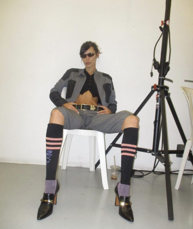 Укороченный костюмный жилет в компании с курткой с акцентными деталями, прямые шорты в полоску под аккомпанемент грубого ремня и мокасины на каблуке в сочетании с разноцветными гольфами – на фоне такого образа кричащий стиль нулевых кажется детской забавой. Модель завершила аутфит на солнцезащитных очках в овальной оправе – так сказать, чтобы была вишенка. Пожалуй, в других комментариях образ не нуждается. Одно ясно точно – такой выход модели определенно запомнится надолго.