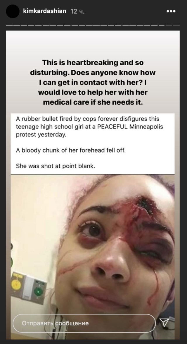 Ким Кардашьян (39) тем временем решила оказать помощь пострадавшим на акциях протеста (а ее сёстры опубликовали в аккаунтах посты с словами соболезнования семье Флойда): так, например, Ким выложила в «Истории» фото избитой девушки и попросила подписчиков помочь найти ее, чтобы «посодействовать в оказании медицинской помощи, если она в ней нуждается».