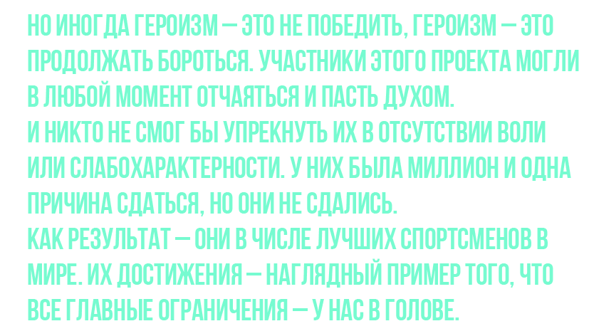 Собрали девять паралимпийских спортсменов (у одних инвалидность – врожденная, у других – приобретенная вследствие несчастного случая), боровшихся за медали в Токио, и публикуем их невероятные истории преодоления преград, обстоятельств и себя самих.