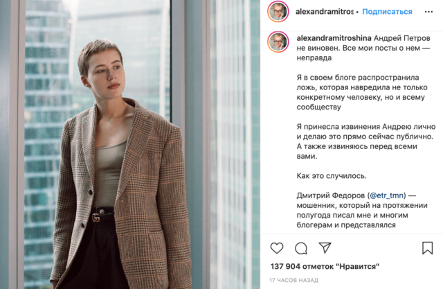 Александра Митрошина мгновенно удалила пост, извинилась перед Андреем и своими фанатами и объяснилась, как произошла такая ситуация. «Дмитрий Федоров – мошенник, который на протяжении полугода писал мне и многим блогерам и представлялся сотрудником Instagram. Чтобы втираться в доверие к незнакомым людям, Дмитрий Федоров подделывал документы и публикации и занимался фишингом», – заявила девушка.