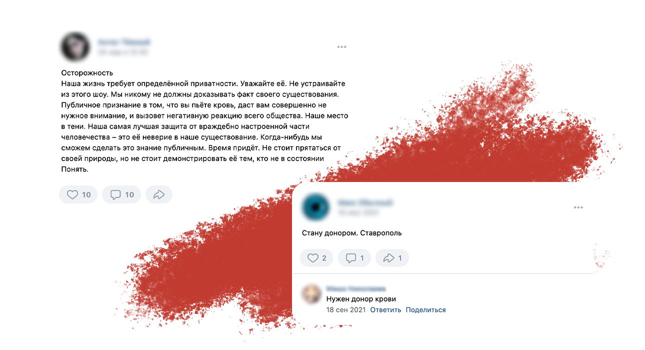 Те, кто называют себя настоящими вампирами, отказываются от встреч, отправляют в блэк-листы, иногда требуют за интервью «молоденькую девушку от 18 лет и специалиста из сферы медицыны для взятия крови» (орфография автора сохранена), а в редких удавшихся разговорах ведут себя крайне скрытно – обсуждать что-то, кроме кровных пожертвований, они готовы неохотно.