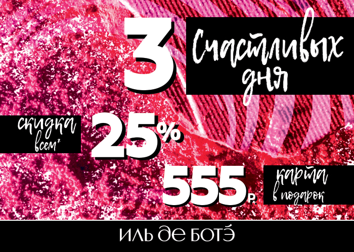 Три дня — 23, 24 и 25 июня – во всех магазинах ИЛЬ ДЕ БОТЭ ты можешь купить все, что захочешь, со скидкой 25%! А если чек окажется больше 2500 рублей, в подарок дадут карточку на 555 рублей!