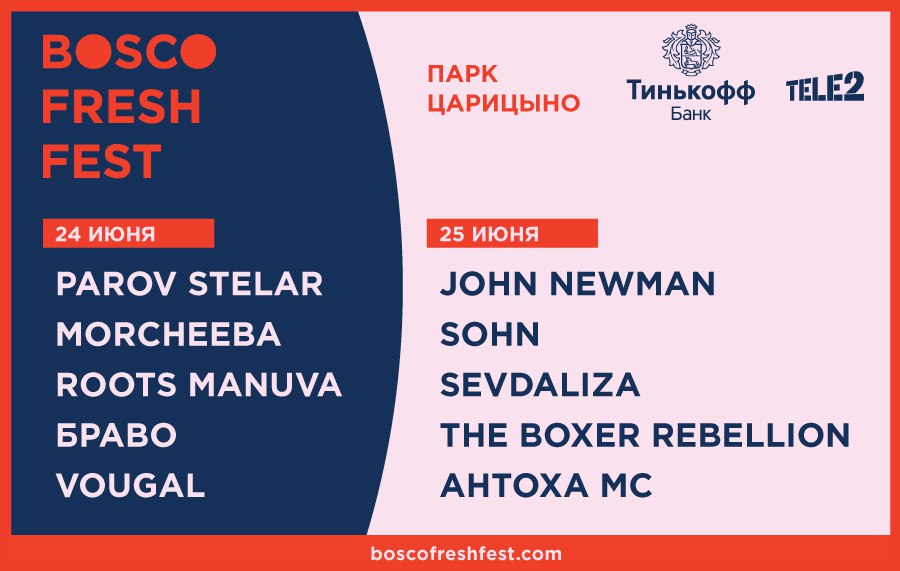 24–25 июня парк «Царицыно» превратится в огромную концертную площадку Bosco Fresh Fest. Среди участников – Джон Ньюмен, австрийский электронный проект Parov Stelar,певец Sohn, рэпер Roots Manuva, Morcheeba, Vougal, Антоха МС и легенды отечественной сцены «Браво».